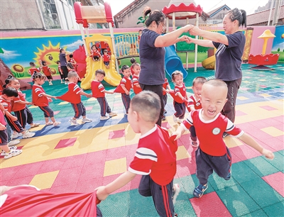 7月27日,河北省遵化市一所幼儿园的教师带领孩子们做游戏。今年暑期,遵化市多所幼儿园不放暑假、继续接收幼儿入园托管,解决了双职工家庭孩子和留守儿童暑期看护难的问题,受到当地家长欢迎。新华社 刘满仓 摄
