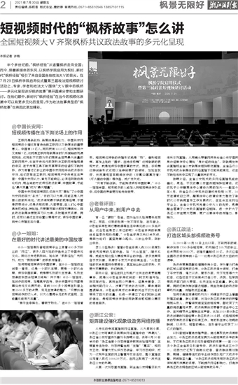 半个多世纪前,“枫桥经验”从诸暨枫桥走向全国;而今,乘着新媒体的东风,以枫桥学院启用为契机,新时代“枫桥经验”吸引了来自全国各地政法大V的目光。在7月29日枫桥学院启用仪式暨第三届政法短视频研讨活动上,专家、学者和政法大V围绕“大V眼中的枫桥——多元化呈现讲好枫桥故事”展开圆桌分享和主题研讨。在他们眼中,新时代“枫桥经验”在当今的视频化浪潮中可以有更多元化的呈现,作为政法故事典型的“枫桥故事”也将因此更加精彩。