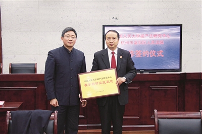 | 2017年12月12日,富阳法院与中国人民大学破产法研究中心签署《合作框架协议》,成为中国人民大学破产法研究中心全国第一家教学科研实践基地 |