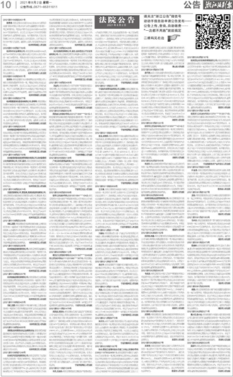 (2021)浙0282民初187号 射洪县弘大针织制衣有限责任公司:本院受理原告宁波慈星股份有限公司诉被告射洪县弘大针织制衣有限责任公司买卖合同纠纷一案,因你方下落不明,现依法向你公告送达(2021)浙0282民初187号民事判决书,判决如下:一、被告射洪县弘大针织制衣有限责任公司于本判决生效之日起七日内支付原告宁波慈星股份有限公司货款91500元及至2019年8月19日止的利息损失33 411.99元,并支付自2019年8月20日起至实际清偿之日止,以货款91 500元为基数按同期银行间同业拆借中心公布的贷款市场报价利率计算的利息损失;二、本案案件受理费2798元,减半收取计1399元,由被告射洪县弘大针织制衣有限责任公司负担,于本判决生效之日起七日内交纳本院。限你方自公告发布之日起60日内来本院民四庭103室领取判决书,逾期则视为送达。如不服本判决,可在公告期满后15日内,向本院提交上诉状及副本,上诉于浙江省宁波市中级人民法院。逾期本判决即发生法律效力。慈溪市人民法院