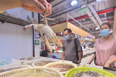 8月3日,杭州凤起路农贸市场的水产摊位上,不少“老饕”来选购梭子蟹尝鲜。随着东海开渔,第一批海鲜已来到杭州市场。专卖海鲜的摊主张飞说,当天出售的梭子蟹都是一早从勾庄和萧山的批发市场进的货,来自舟山沈家门。今年因为供应充足,总体价格不高。