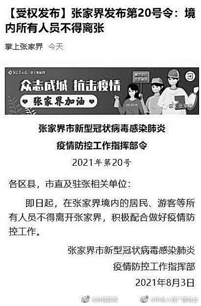 8月3日,湖南张家界发布新冠肺炎疫情防控工作指挥部令:即日起,在张家界境内的居民、游客等所有人员不得离开张家界,积极配合做好疫情防控工作。