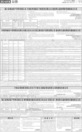 浙江省浙商资产管理有限公司 宁波杭州湾新区千帆投资有限公司 债权转让通知暨债务催收联合公告