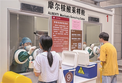 针对“德尔塔”变异毒株带来的新形势、新变化,省卫生健康委升级核酸检测能力,按照24小时内基本完成区域全员新冠病毒核酸检测的目标,完善大规模新冠病毒核酸检测的工作预案,加强核酸检测工作人员配备和相关物资的储备。图为8月7日,杭州市红十字会医院的医护人员在摩尔核酸采样舱内对市民进行核酸采样。