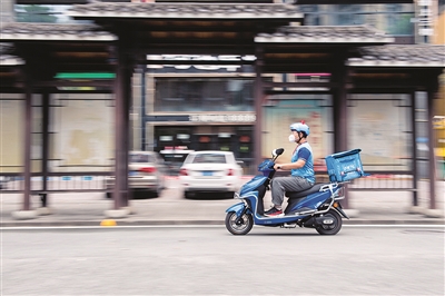 8月9日,在张家界永定区永定街道,外卖员燕赢召在骑车送外卖的路上。