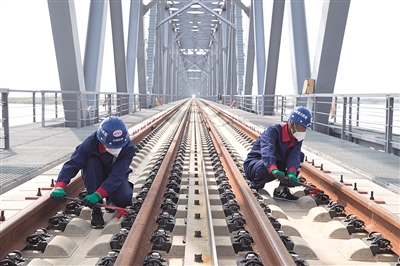 当日,在同江中俄黑龙江铁路大桥施工现场,中俄两国准轨接口最后一组轨道夹板安装完成,标志着中俄两国首座跨江铁路大桥——同江中俄黑龙江铁路大桥实现铺轨贯通,为大桥全线开通运营奠定了坚实基础。