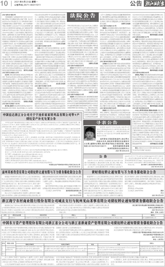 中国信达浙江分公司关于宁波彩家家居用品有限公司等9户债权资产补充处置公告