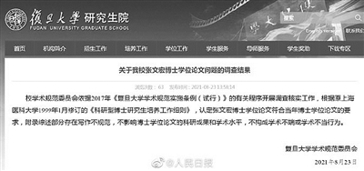 复旦大学学术规范委员会23日发布“关于我校张文宏博士学位论文问题的调查结果”:校学术规范委员会依据2017年《复旦大学学术规范实施条例(试行)》的有关程序开展调查核实工作,根据原上海医科大学1999年1月修订的《科研型博士研究生培养工作细则》,认定张文宏博士学位论文符合当年博士学位论文的要求,附录综述部分存在写作不规范,不影响博士学位论文的科研成果和学术水平,不构成学术不端或学术不当行为。