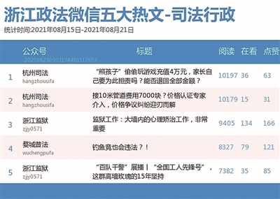 本期司法行政榜,“浙江监狱”摘冠,“杭州司法”“婺城普法”分获亚军、季军。“杭州司法”的《“熊孩子”偷偷玩游戏充值4万元,家长自己要为此担责吗?能否退回全部金额?》夺得热文榜第一。妥善解决未成年人因网络充值、网络打赏等行为造成的合同纠纷问题,是家长和网络平台共同的责任。