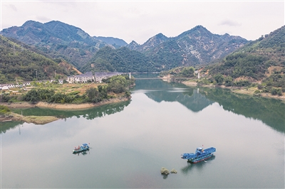 8月24日,杭州市临安区龙岗镇的党员志愿者在华光潭水库乘船打捞库面漂浮物。