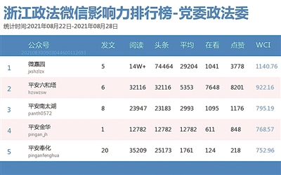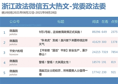 本期占据政法委榜榜首的依旧是“微嘉园”。该公众号持续发力,本周有4篇文章入围热文榜前五名,其中《9月1号起,这些教育政策正式实施!》一文以“89296”的阅读数拿下冠军。开学在即,这篇推文对2021年秋季新学期将要实施的教育政策进行了整理解读,非常实用。