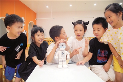 9月6日,湖州市南浔实验幼儿园内,小朋友正和AI机器人“悟空”现场互动。近年来,南浔区教育、科技等部门在幼儿园、小学、初中课堂内普及AI互动体验教学,AI机器人具备游戏化、可视化功能,可有效提高学生学习兴趣与课堂专注力,提升学习效率和成绩。