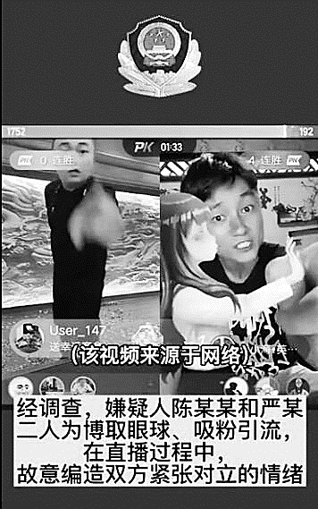 近日,2名云南网红主播在直播时,因语言纠纷在线约架。经警方调查,2人均系同一公司艺人,为博取眼球,在直播过程中故意编造双方紧张对立的情绪。公安机关介入后,2人认识到自身行为的违法性和严重后果,公开向社会公众道歉。