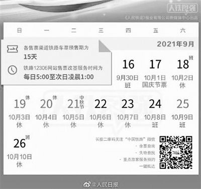 9月17日,十一黄金周火车票正式开售。铁路车票预售期为15天,旅客可在同一起售时间,通过12306网站、铁路12306手机App等方式购买车票,具体起售时间可通过12306网站(含客户端)查询。出行务必做好个人防护!