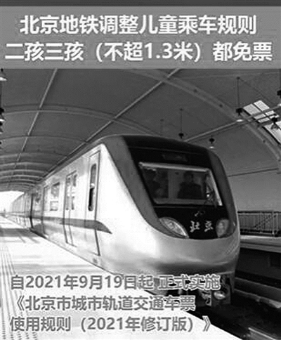 为提供高质量的轨道交通票务服务,自2021年9月19日起《北京市城市轨道交通车票使用规则(2021年修订版)》正式实施,新规取消了“带领两个以上身高不满1.3米的儿童乘车,一个儿童免票”的规定,这意味着身高不超1.3米的二孩三孩今后都可免费乘坐地铁。