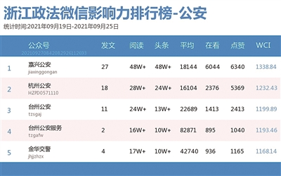 本期公安榜,竞争激烈,“嘉兴公安”突出重围,拿下第一。热文榜上,有3篇文章阅读量达到“10万+”,其中“台州公安”的《浙江警界主持人大赛来了!12号吴雨薇,快来为她投票吧~》获得第一。