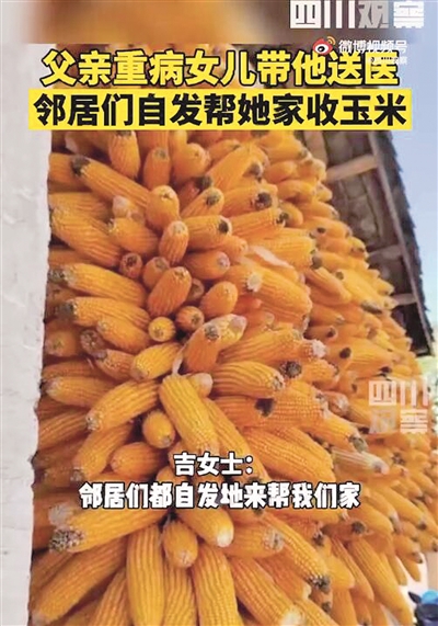 近日,四川凉山喜德县,吉女士父亲病重在医院就医,致家里大量庄稼无人收。邻居们获知后,自发帮忙为吉女士收玉米。吉女士表示,在医院的时候看到邻居录下的视频,非常感动。