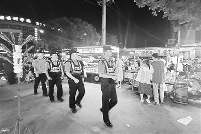 近日,台州市公安局椒江区分局章安派出所民辅警在辖区夜市巡逻,确保夜市摊点和群众财物安全。今年以来,章安派出所通过民警徒步巡逻与警车巡逻相结合的方式,加强了夜间巡逻防控力度,夜间违法犯罪案件大大下降。