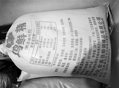 只见姚某军从身边的一个大塑料盆里,舀出一些黄色颗粒物,倒进印有“太太乐”“大桥”鸡精等字样的包装袋,称好后,用摆在面前的一台自动封口机封口,一套流程下来,3-4元钱一包的杂牌鸡精,摇身一变成了身价20多元的“知名品牌”。