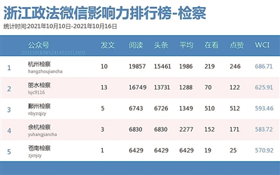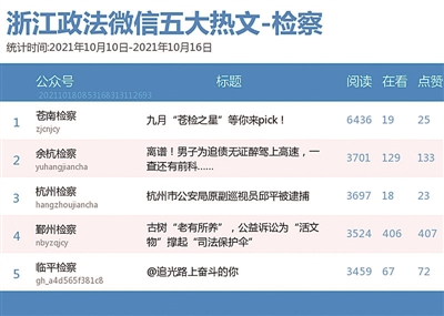 本期检察院榜,“杭州检察”夺冠,“丽水检察”次之。热文榜上,“苍南检察”的《九月“苍检之星”等你来pick!》一文备受关注,排名第一。