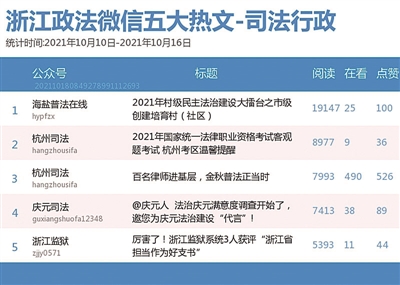 本期司法行政榜,“杭州司法”本期夺冠,“海盐普法在线”跃居第2名。热文榜首则是“海盐普法在线”的《2021年村级民主法治建设大擂台之市级创建培育村(社区)》,该文对2021年度申报当地市级民主法治村(社区)创建的11个村(社区)逐一作了介绍,并在线上进行投票活动,收获近2万网友的关注。