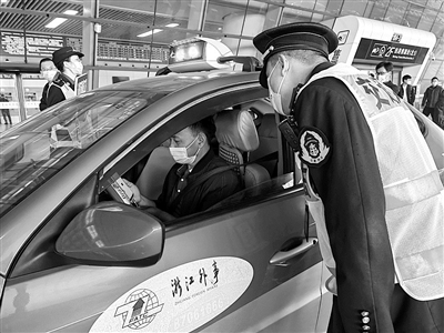 “师傅,请停一下。”在杭州东站二楼出发层,市交通运输行政执法队铁路枢纽执法大队中队长何翔透过窗户,发现一辆出租车内,驾驶员将口罩兜在下巴上,嘴鼻都暴露在外,于是伸手将其拦下,要求司机出示健康码、佩戴好口罩后,再重新上路。