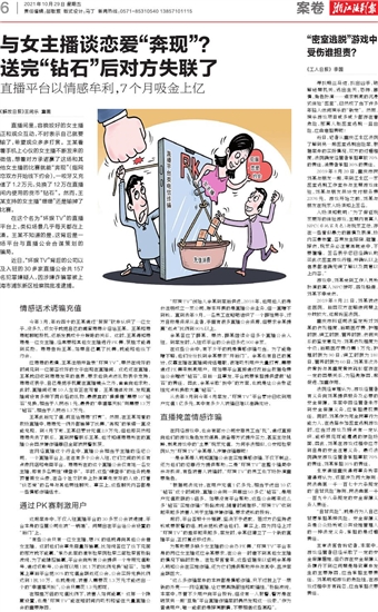 直播间里,容貌姣好的女主播正和观众互动,不时表示自己就要输了,希望观众多多打赏。王某看着手机上心仪的女主播不断发来的微信,想着对方承诺赢了这场和其他女主播的比赛就能“奔现”(指网恋双方开始线下约会),一咬牙又充值了1.2万元,兑换了12万在直播间内使用的货币“钻石”。然而,王某支持的女主播“珊珊”还是输掉了比赛。
