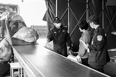 近日,平湖市公安局林埭派出所组织民警深入辖区快递公司,就是否严格落实实名制登记、揽收验视等问题进行检查,并及时整改问题。图为民警在检查中对工作人员进行安防宣传。通讯员 谢远远