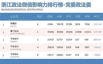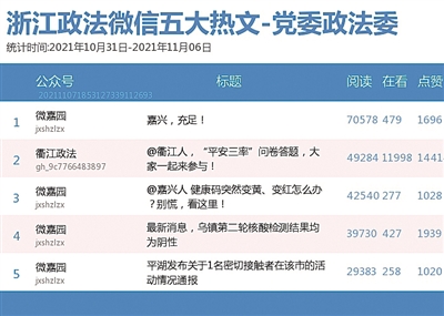 本期政法委榜,“微嘉园”以22万+的阅读量“C位出道”。在热文榜的10个席位中,该公众号斩获6席,是当之无愧的“实力王”。其中,《嘉兴,充足!》一文以7万多的阅读量位居热文榜榜首。