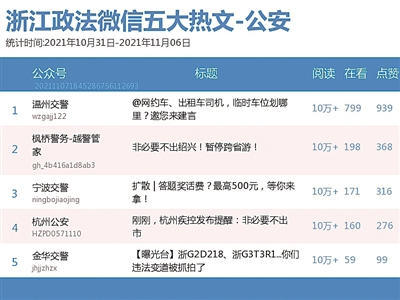 本期公安榜的前三名分别为“杭州公安”“枫桥警务-越警管家”“台州公安”。热文榜上,“温州交警”推出的《@网约车、出租车司机,临时车位划哪里?邀您来建言》关注度最高。