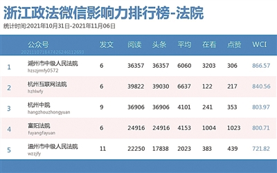 法院榜,“湖州市中级人民法院”荣登榜首。热文榜上,获得最高关注的则是“杭州互联网法院”的推文——《银行上传不良征信信息被起诉,法院:驳回》。