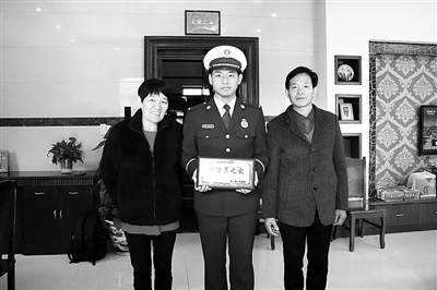 | 收到“消防员之家”光荣牌后,卫波洋一家拍了张合影 |