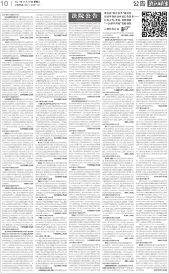 (2021)浙0282民初10793号 王军:本院受理的原告吴迪峰与被告王军民间借贷纠纷一案,因无法用其他方式向你送达,现依法向你公告送达起诉状副本、应诉通知书、证据副本、举证通知书、开庭传票、廉政监督卡、民商事案件诉讼须知、自动履行告知书、民事裁定书等。自发出公告之日起经过六十日即视为送达。提出答辩状期限和举证期限为公告送达期满后的15日内,并定于2022年1月24日上午9时0分在本院范市人民法庭公开开庭审理,逾期将依法缺席判决。慈溪市人民法院(2021)浙0282民初10202号 付平:本院受理的原告张新宾与被告付平买卖合同纠纷一案,因无法用其他方式向你送达,现依法向你公告送达起诉状副本、应诉通知书、证据副本、举证通知书、开庭传票、廉政监督卡、民商事案件诉讼须知、自动履行告知书、民事裁定书等。自发出公告之日起经过六十日即视为送达。提出答辩状期限和举证期限为公告送达期满后的15日内,并定于2022年1月24日下午13时30分在本院范市人民法庭公开开庭审理,逾期将依法缺席判决。慈溪市人民法院(2021)浙0282民初7369号 郭浪:本院受理原告郭东诉被告郭浪健康权纠纷一案,已审理终结。现依法向你公告送达(2021)浙0282民初7369号民事判决书,判决如下:一、被告郭浪赔偿原告郭东损失36593元,于本判决生效之日起三日内履行;二、驳回原告郭东的其余诉讼请求。自公告之日起60日内来本院范市人民法庭领取民事判决书,逾期视为送达。如不服本判决,可在公告期满后十五日内,向本院递交上诉状及副本,上诉于浙江省宁波市中级人民法院。逾期未上诉的,本判决即发生法律效力。慈溪市人民法院