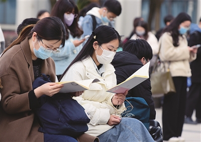 11月28日,在江苏无锡旅游商贸高等职业技术学校考点,考生在等候进场时复习。
