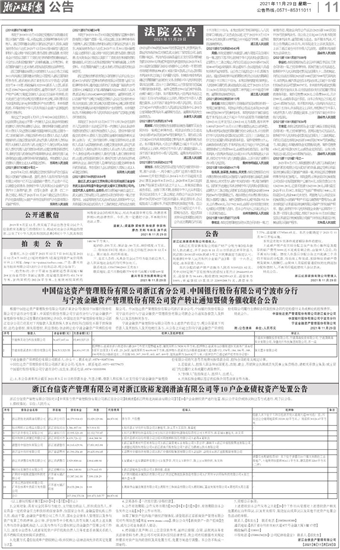 中国信达资产管理股份有限公司浙江省分公司、中国银行股份有限公司宁波市分行 与宁波金融资产管理股份有限公司资产转让通知暨债务催收联合公告