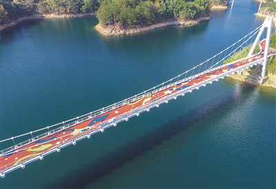 11月29日,淳安县淳杨线骑行桥经过近一个月的维护焕然一新,骑行桥路面画上了彩带、大鱼等图案,与自然景观互相映衬。淳杨线骑行桥是国内第一座骑行悬索桥,全长168米,是千岛湖环湖绿道骑行的一个标志性建筑,成为骑行爱好者骑行漫步、欣赏千岛湖美景的最佳之处。王建才 余骞 摄
