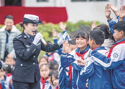 12月2日,在六盘水市水城区发耳镇发耳小学,六盘水市公安交通管理局高速大队民警和学生们进行交通知识抢答互动。