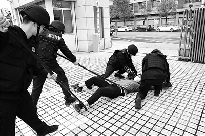 图为民警控制住一名持刀“歹徒”。通讯员 何文斌 摄
