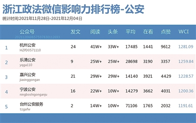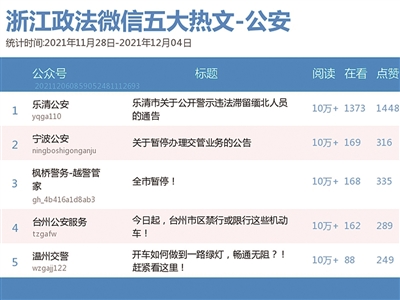 本期公安榜的前三名分别为“杭州公安”“乐清公安”“嘉兴公安”。热文榜上,有5条推文获得10万+的阅读量。