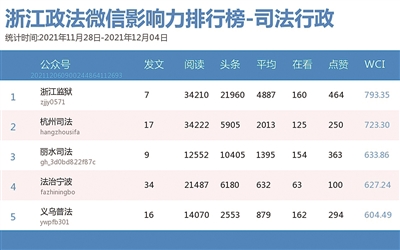 司法行政榜上,老将“浙江监狱”发挥稳定,夺得第一。热文榜中,“法治宁波”的《12·4国家宪法日暨“宪法与浙江”宣传月》一文荣登榜首。