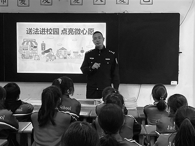 近日,温州市公安局龙湾区分局民警走进新居民子弟学校,开展以“送法进校园、点亮微心愿”为主题的“关爱‘新二代’、健康伴你行”活动。图为状元派出所民警给“新二代”学生讲解反诈知识。