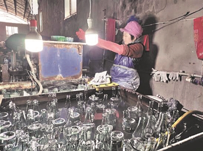 现场,三组人员正在进行清洗酒瓶作业。这些回收的白酒酒瓶原本沾满泥灰,经过水洗和机器去除包装纸后,酒瓶变得十分光洁。不过,仔细观察,瓶内还是有少许黑点。