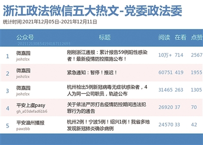 本期政法委榜,“微嘉园”夺魁,该公众号包揽了热文榜前三,其中《刚刚浙江通报:累计报告59例阳性感染者!最新疫情防控措施公布!》一文,以“10万+”的阅读数拿下冠军。