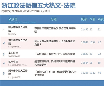 法院榜上,前三名依次是“杭州中院”“湖州市中级人民法院”“丽水市中级人民法院”。其中,“丽水市中级人民法院”的《市委召开法院工作会议 李占国胡海峰讲话》一文,拿下热文榜第一。