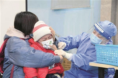 | 在海淀区中关村街道新冠疫苗接种点,医护人员为一名小朋友接种新冠疫苗。新华社 |