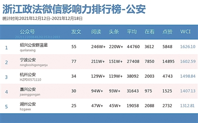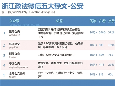 本期公安榜前三依次为“绍兴公安群蓝星”“宁波公安”“杭州公安”。热文榜前十的阅读量均破“10万+”。其中,《泪别英雄!乐清民警陈源凯因公牺牲:生命最后的几小时 他仍在交代疫情防控工作》一文感人至深,被大量转发。