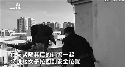 12月19日,安徽合肥一名女子趴在18层楼顶边缘哭泣。警方劝告时,该女子逐渐体力不支。事态紧急,瑶海公安分局花冲派出所教导员侯昌明果断越过楼顶护墙,与紧随其后的辅警合力将该女子拉回到安全位置。