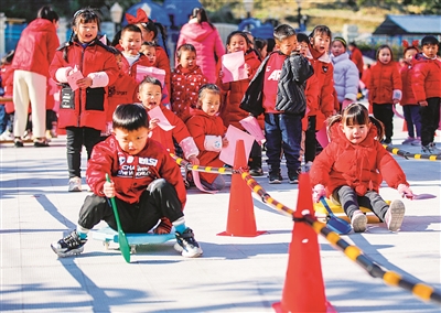 12月27日,淳安县千岛湖镇南景幼儿园举行“快乐小鱼娃 欢喜庆元旦”童玩节系列活动。孩子们通过小鱼娃背背乐、鱼儿吐泡泡、小鱼摆尾等富有地域特色的传统游戏,迎接新年的到来。王建才 余露 摄