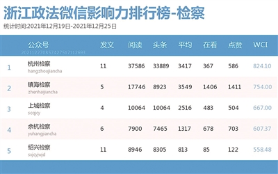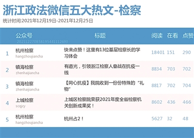 本期检察院篇,“杭州检察”获双料冠军;“镇海检察”表现优异,在热文榜单前三席中占据两席,话题依然有关疫情。