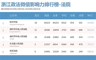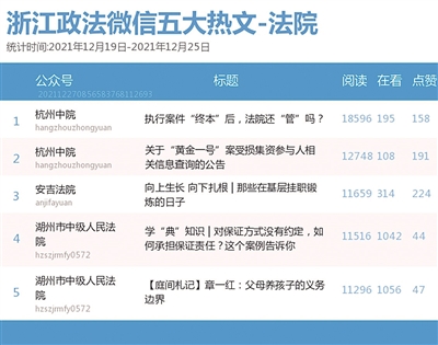 本期法院篇,榜单前三依次为“杭州中院”“湖州市中级人民法院”“温州市中级人民法院”。热文榜上,“杭州中院”的《执行案件“终本”后,法院还“管”吗?》一文介绍了执行程序中“终本”的相关知识,干货满满。